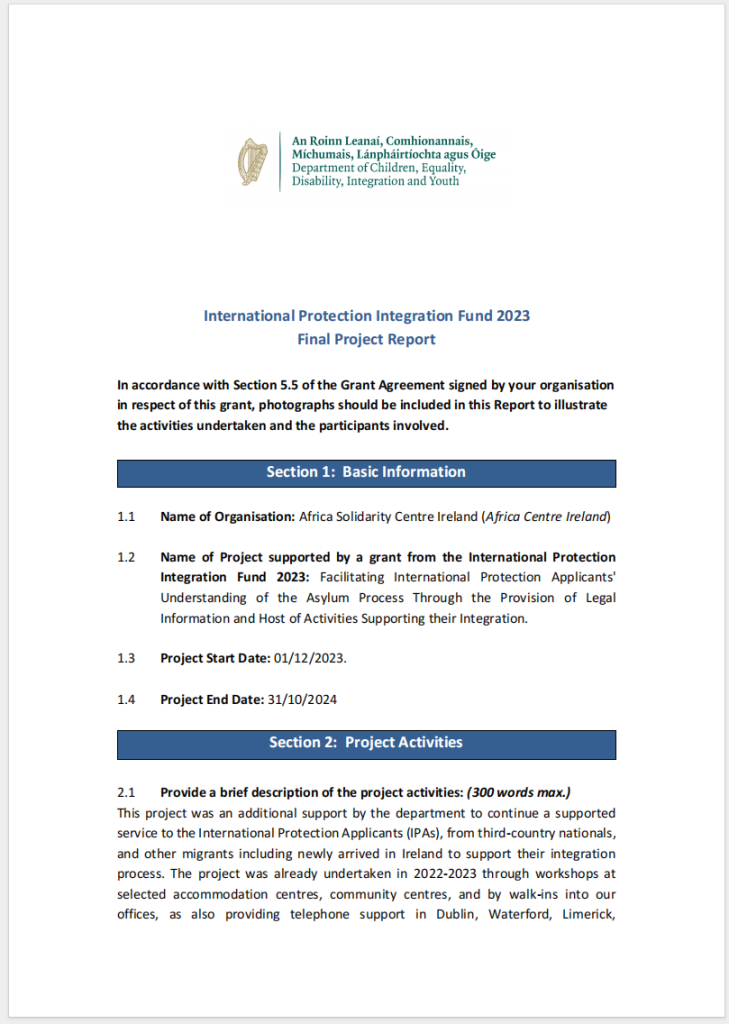 This project was an additional support by the department to continue a supported service to the International Protection Applicants (IPAs), from third-country nationals, and other migrants including newly arrived in Ireland to support their integration process.